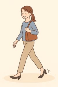 腕を軽く振り、膝をしっかり伸ばして歩くと、パンプスのフィット感が高まり、脱げにくくなります。
