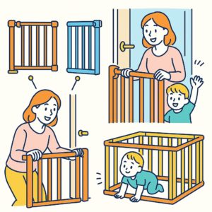 - ベビーゲート:部屋の出入口や危険エリアを塞ぐために設置